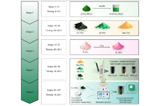 针对这一难题,本研究团队统介绍了过渡金属敏化镧系近红外发光纳米粒子的合成方法,为高性能发光材料的开发提供了标准化方案。该协议详细阐述了从三氟乙酸盐前驱体制备到最终纳米粒子合成的全流程,涵盖铬、锰、镍三种过渡金属离子作为敏化剂的合成路径。与传统镧系材料相比,过渡金属离子具有更高的摩尔吸光系数,能够显著提升材料的吸光能力和发光效率。