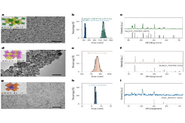 图2. (a-c)铬敏化镧系纳米颗粒(Na3CrF6:Er)的结构与形貌表征。